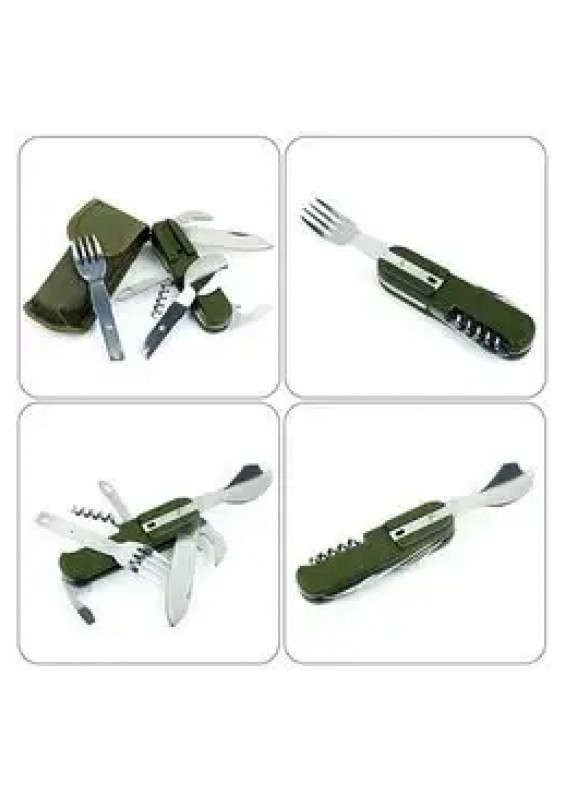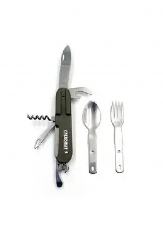 Мультитул изготовлен из комплектующих высочайшего качества, которые выполнены из особопрочной нержавеющей инструментальной стали.Режущие кромки ножей остро заточены, а эргономичная рукоятка обеспечивает удобство и безопасность использования изделия.Помимо ножа, штопора шила и открывашки, в комплект мультитула входят вилка и ложка, а значит с этим комплектом вы всегда будете иметь столовые приборы под рукой. Компактный размер позволяет хранить столовые приборы в небольшом чехле.