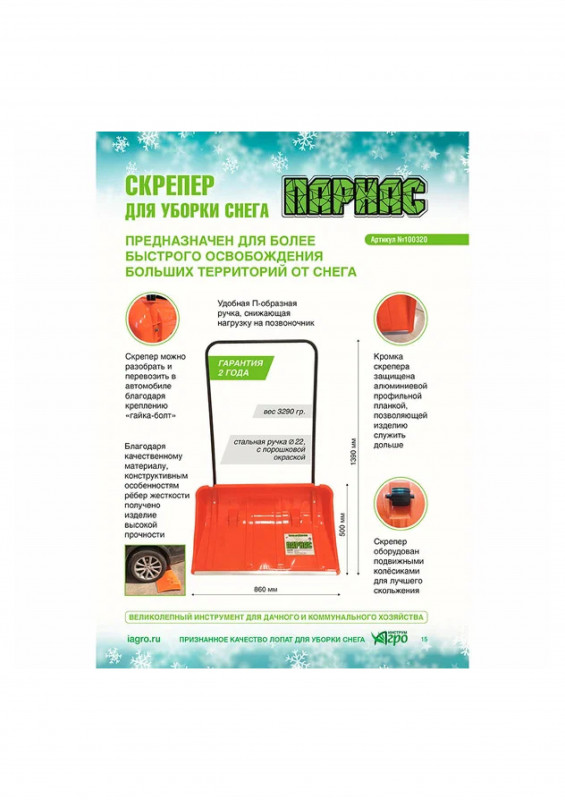 Скрепер для уборки снега 860х500мм с метал.ручкой на колесиках Парнас