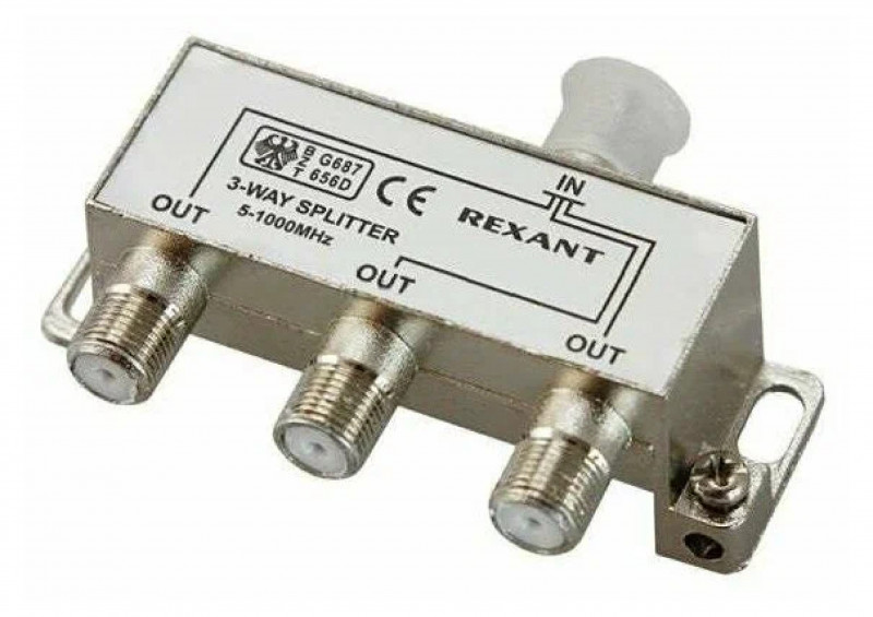Делитель имеет один вход под F разъем и три выхода, также под F разъемы. Сигнал, подающийся на вход делителя, делится на три равные части и передается на выходы. Для подключения кабелей используются стандартные F-разъемы. Полоса пропускания делителя от 5 до 1000МГц, эти частоты используются для стандартного эфирного телевидения. Качественно изготовленный ТВ сплиттер REXANT долго и надежно прослужит в составе телевизионной системы, делая удобной эксплуатацию нескольких телевизоров.